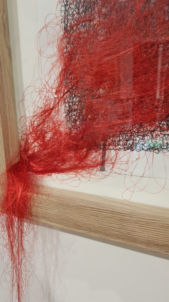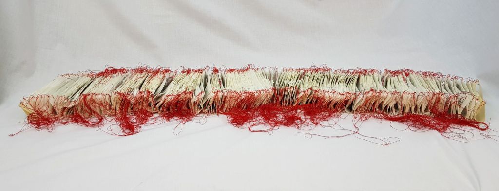 I began to see how it might all go together – the names, the thread, the broken glass. The broken glass allowed the thread to be both inside and outside. As I experimented with framing using the mat board, I was initially annoyed that it was one that was just the tiniest little bit too big for the paper. I placed them all together, so I could look at it while I decided what to do. As often happens, it was as I spied it out of the corner of my eye one day that I decided what to do: leave it and allow the slight ripple to be visible. Maybe this was a cop out, but I have always liked the ripple of wet paper even though it is normally then enticed to be flat again. But it worked here, being able to see the whole piece of paper and its buckling, while still being framed. Red cotton underneath the glass and outside of it. Encased but not contained.
