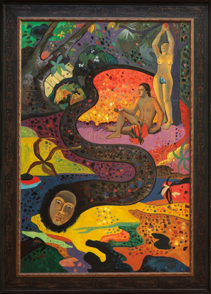 Below the central figure is the kalabaw, the native water buffalo which is often used as a symbol of the hard-working prosperity of the nation; but here it has died. Underneath, a friar knocks over an indigenous woman representing the ongoing impact of political and religious colonialism. To the right, a figure with a telescope, the current president, is seen spying on the helpless, while a hand comes in with a red yo-yo, an action that names “red tagging” or accusing trouble makers of having anti-government sentiments. And then, finally, tucked in near a golden door, is the historic figure of José Rizal, the great hero of the independence movement who was executed in 1896. He was a writer, artist, and scientist, and Garibay gives him a position of understated prominence in this work, affirming the role of the artist, who might see more clearly what is going on in these fractured and overwhelming times. The entire work is imbued with a golden light, full of promise and prosperity, that turns, at times, into a sulphurous yellow, toxic and decaying. The artist does not offer a possible future, but rather a contemporary view of this historical moment, full of warnings of danger that call for urgent response.