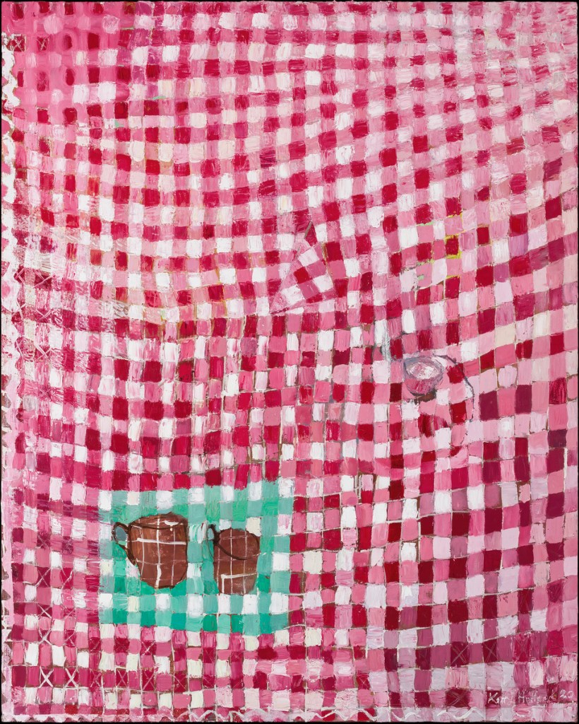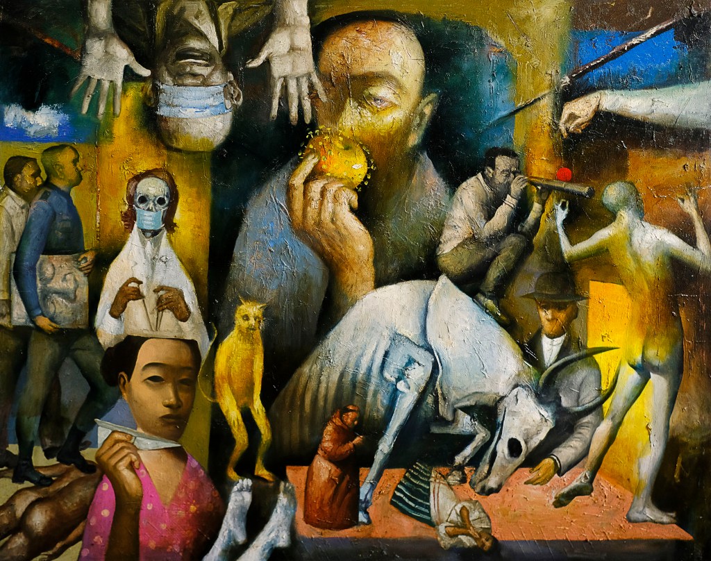The work Selda, or prison cell in English, is a work that responds to current issues facing the Philippines, and, in turn, other regions around the world in the face of the COVID-19 pandemic, increased military and political activity, and the resultant curtailment of individual freedoms. It is a large-format work made up of many smaller elements that are painted in an expressive and textured manner. The central figure of the composition is eating a golden apple, a symbol that should offer the promise to live forever, but instead has become infected with the coronavirus. To the left, a front-line health worker pales into death, sacrificed by a government that prefers to spend money on military budgets. Two authoritative figures carry a large book with the names of those who need to be sanctioned or disciplined, and then walk over a dead body. A figure in the sky is blinded by a face mask that has slipped over their eyes, a representation of delusion and false news. A woman flies a paper plane, representing the huge number of Filipino workers overseas who contribute more than ten percent of the nations’ income, while a sinister yellow cat lurks in the shadows.